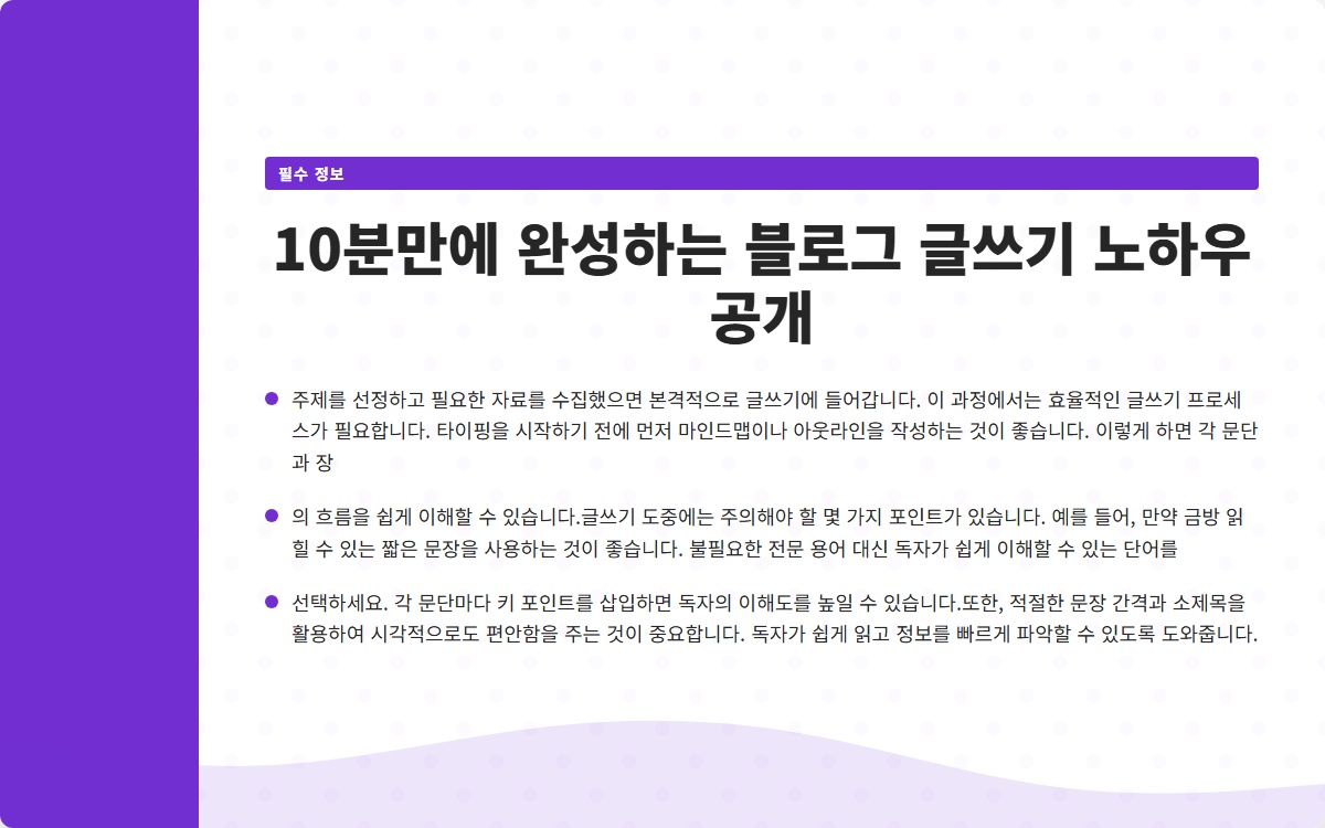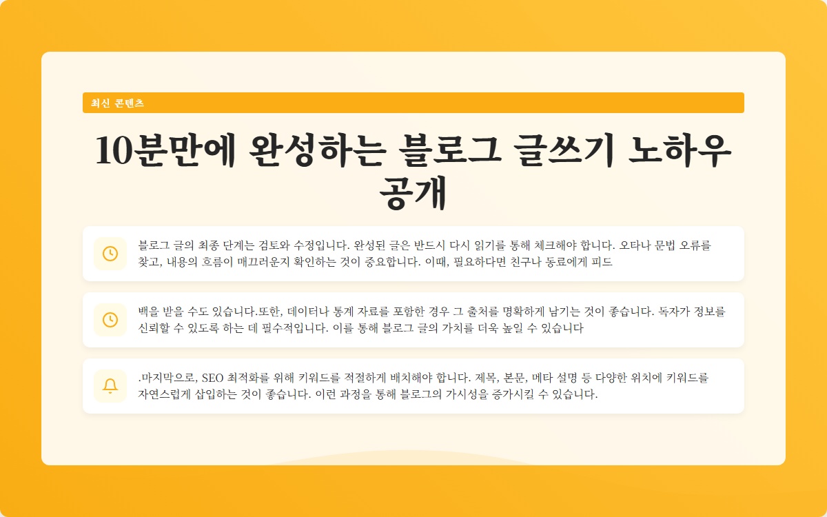 블로그 글쓰기는 한 번에 완벽하게 할 수 있는 것이 아닙니다. 그러나 위에서 언급한 단계별 접근법을 통해 누구나 자신만의 블로그 글을 효과적으로 작성할 수 있습니다. 주제 선정, 글쓰기 프로세스 정리, 그리고 검토와 수정을 통해 10분이라는 짧은 시간 안에 글을 완성할 수 있게 됩니다.