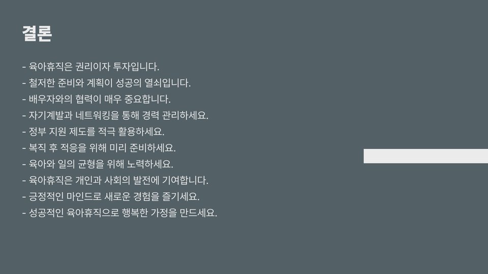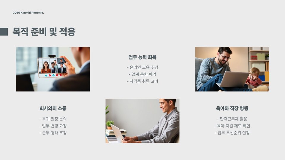 - 복직 준비를 철저히 하여 원활하게 업무에 복귀하자.