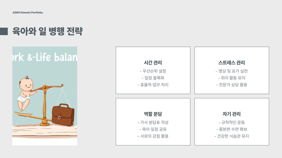 마지막으로, 복직 후에도 자녀와의 시간을 소중히 여기는 것을 잊지 마세요. 자녀의 성장 과정에 계속 참여하며, 가정과 직장에서의 균형을 잘 유지하는 것이 필요한 시점입니다. 부모로서의 역할과 직업인으로서의 역할을 조화롭게 수행하는 것이 중요합니다.