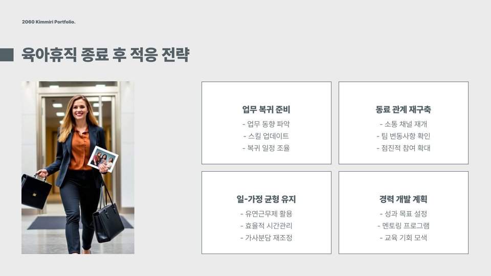 육아휴직 중 쌓은 경험을 바탕으로, 복직 후의 업무 방식이나 역할을 재조정할 수 있습니다. 유연근무제나 재택근무와 같은 옵션이 있다면, 이를 적극적으로 활용하여 업무와 육아의 균형을 맞추는 것이 중요합니다.