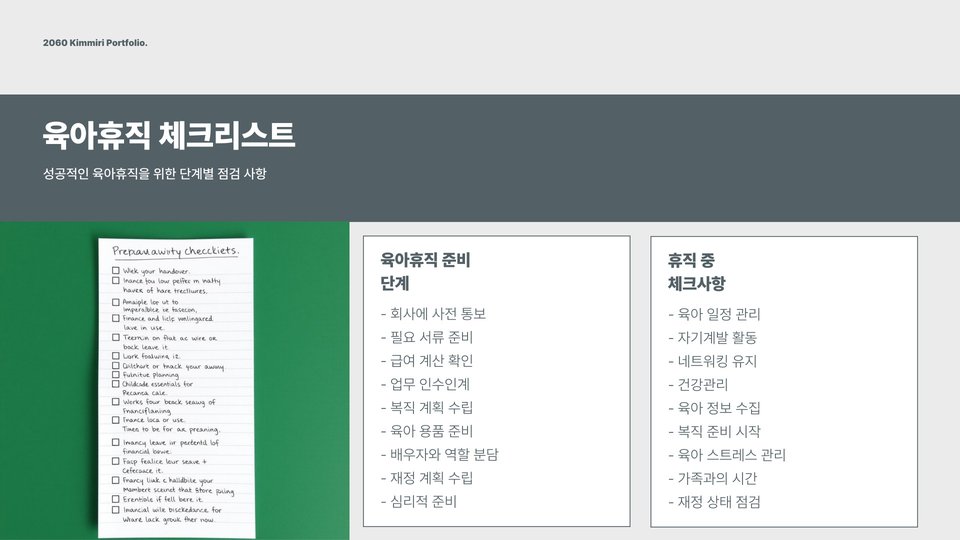 육아휴직이 끝나갈 무렵, 복직 준비를 위한 계획이 중요합니다. 부모는 복직 후에 업무와 가사, 육아를 병행해야 하므로, 이러한 변화에 미리 대비하는 것이 필요합니다. 복직 전에는 회사와의 소통을 강화하고, 업무 복귀에 대한 기대를 명확히 공유해야 합니다.