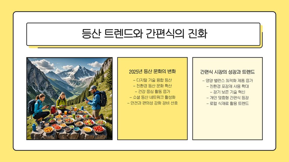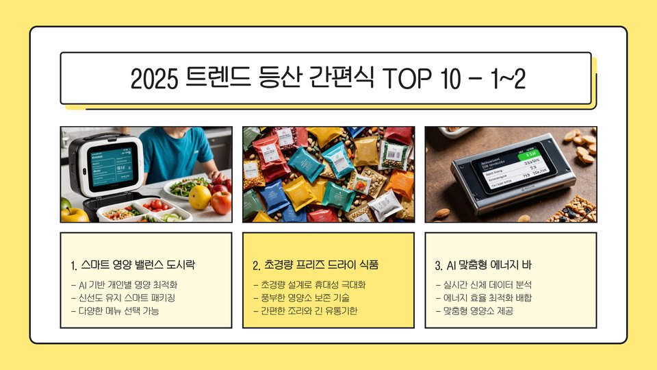 Tags: 등산, 간편식, 2025년 트렌드, 건강식, 비건, 유기농, 영양소, 알레르기, 에너지바, 즉석식품