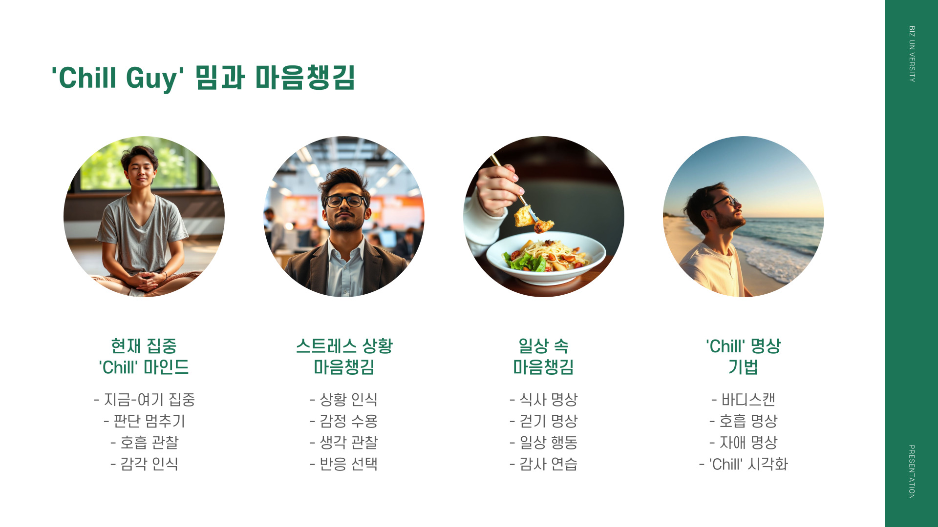 - 일상 속에서 여유로운 태도를 유지하세요.