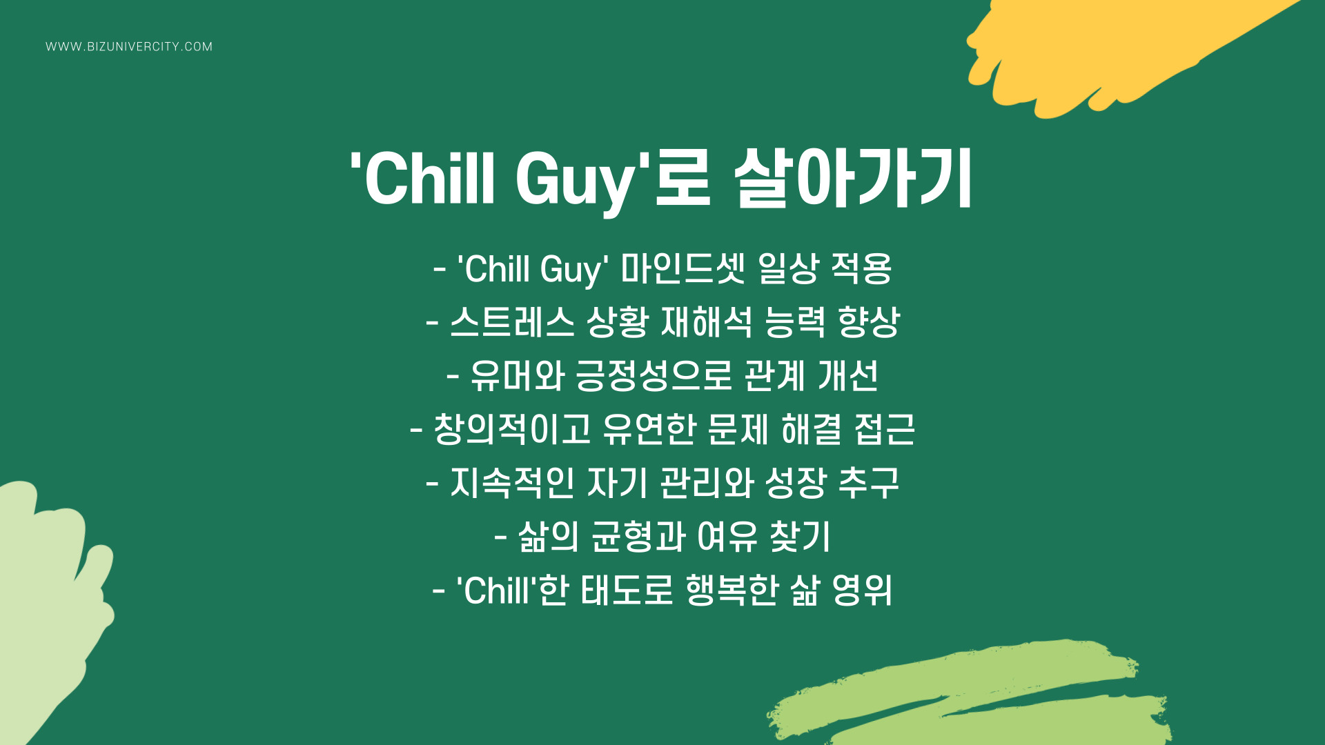 중요한 것은, 이 밈이 단순한 유머를 넘어 실질적인 교훈과 전략을 제공합니다. Chill Guy의 태도를 통해 우리는 복잡한 상황에서도 긍정적인 마인드를 유지할 수 있습니다. 이를 통해 스트레스의 부정적인 영향을 줄이고, 보다 건강한 정신 상태를 유지할 수 있습니다.