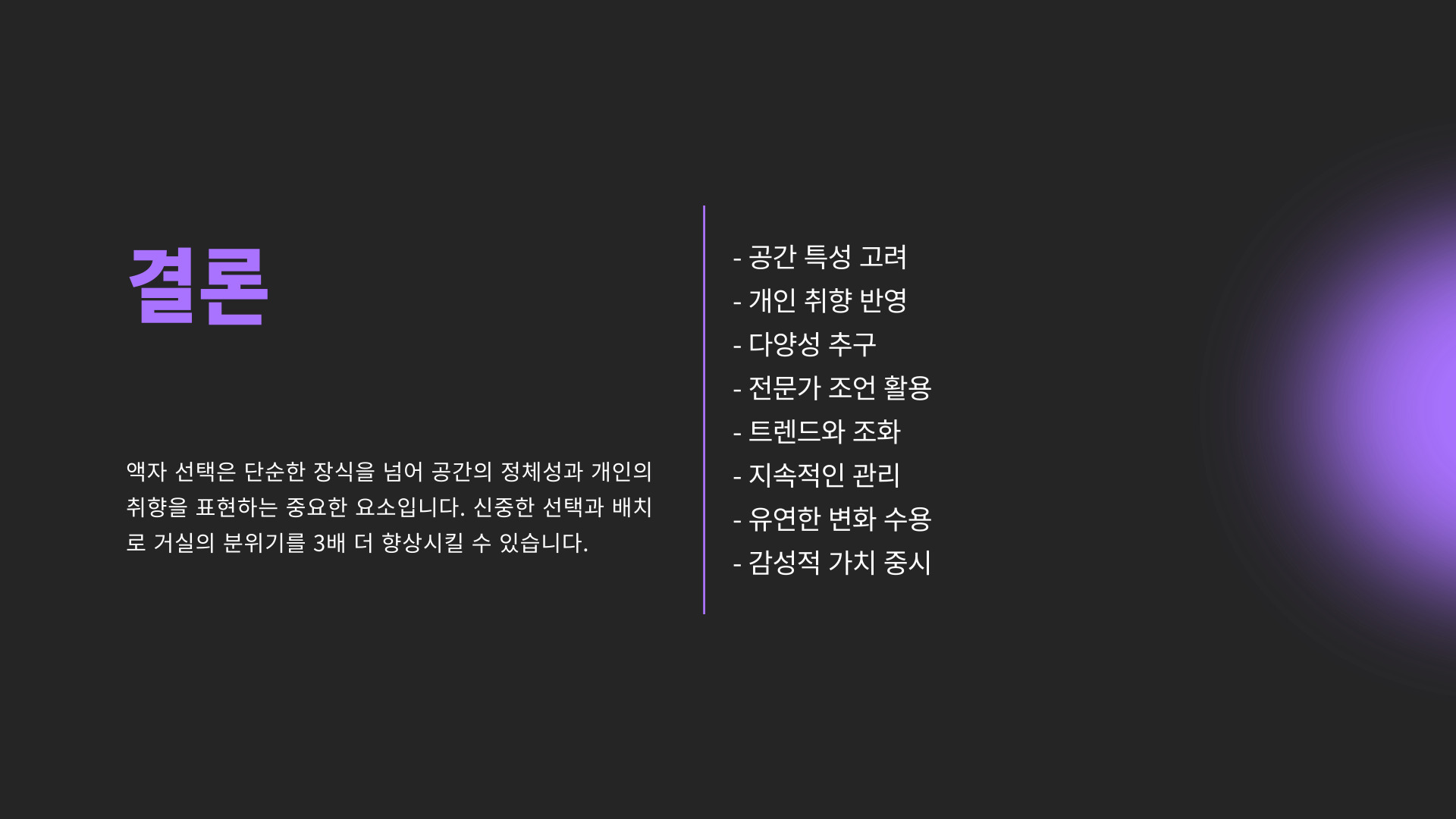 결론적으로, 거실그림액자를 적절하게 선택하고 관리하면 거실의 매력을 끌어올리는 데 큰 도움이 됩니다. 이러한 요소들을 고려하여 나만의 독특한 거실을 완성해 보세요!