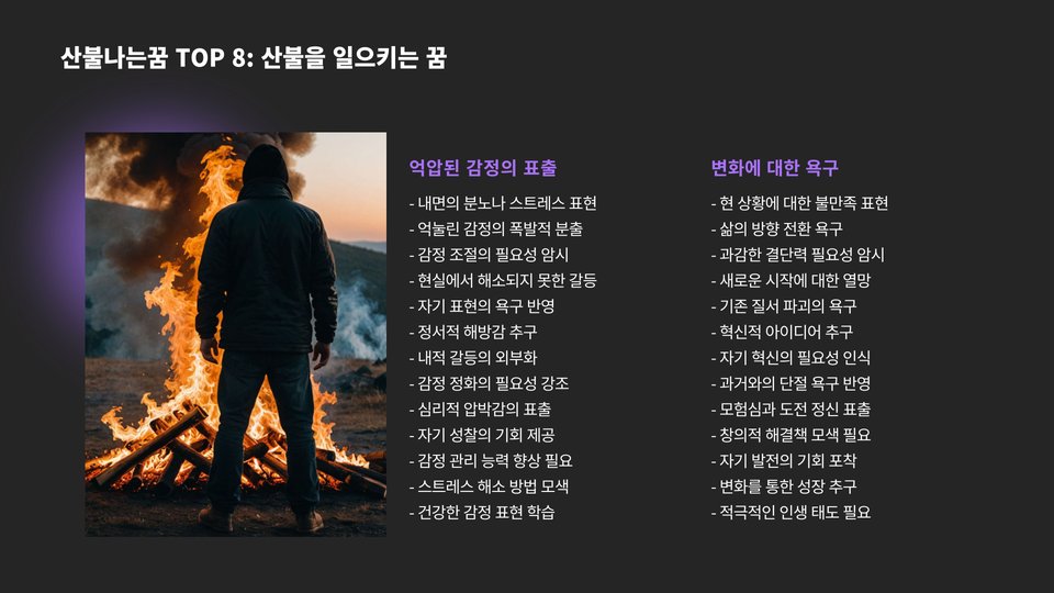 마지막으로, 꿈의 맥락과 개인의 상황에 따라 산불나는 꿈은 서로 다른 의미를 가질 수 있습니다. 꿈의 주인공이 누구인지, 그리고 그 꿈이 나타나는 순간의 감정이 무엇인지에 따라 해석은 다양합니다. 꿈의 배경, 즉 장소와 사람들도 중요한 요소입니다.