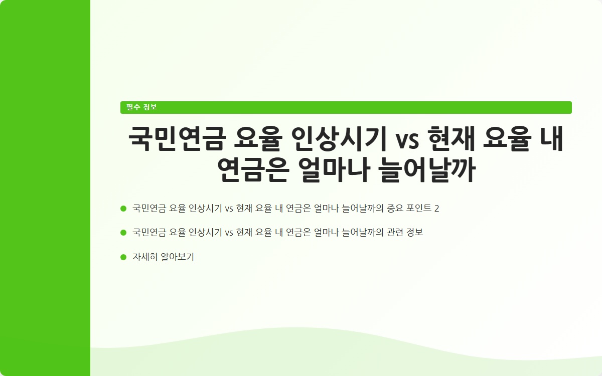 국민연금의 요율 인상에 대한 이해는 우리의 재정 계획에 큰 영향을 미칠 것입니다. 국민연금 개혁안을 통해 보다 나은 미래를 준비할 수 있도록 지금부터 준비하는 것이 중요합니다.