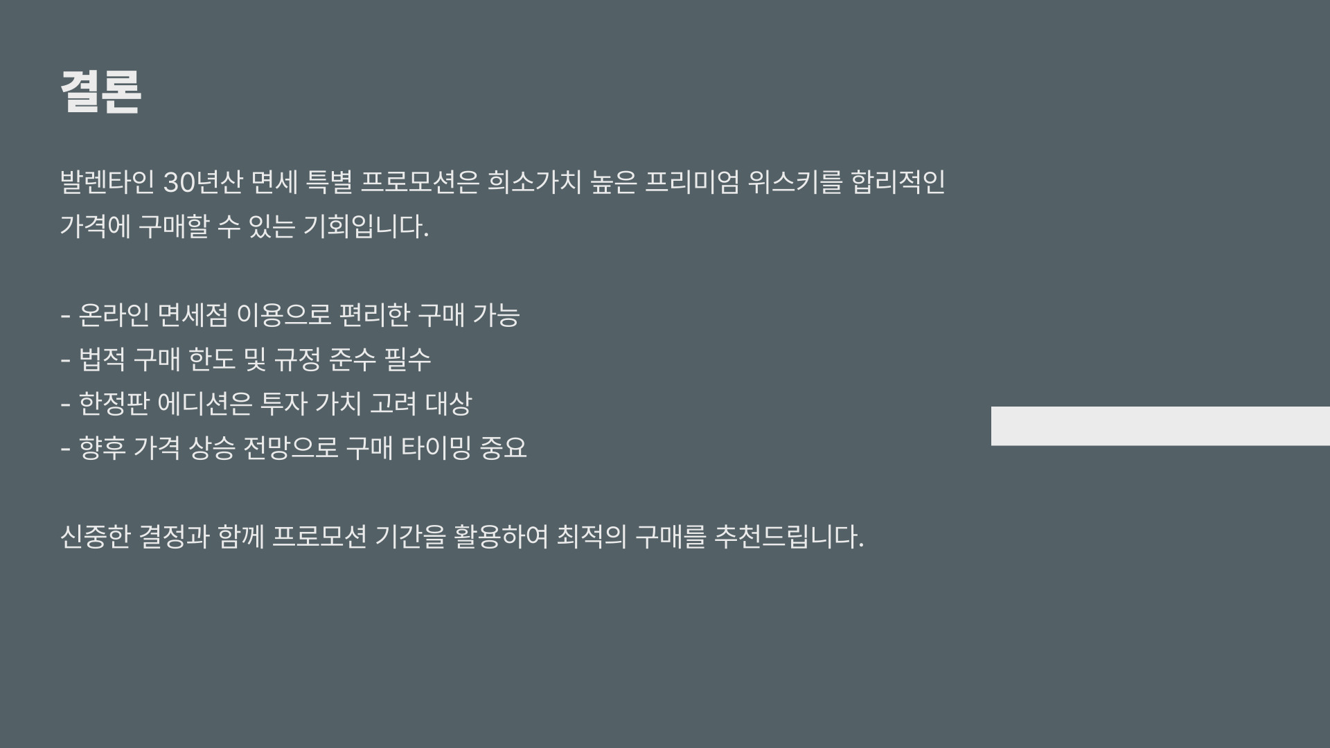 오늘 우리는 발렌타인 30년산의 면세가격과 구매 방법에 대해 알아보았습니다. 면세점에서 구매하는 경우 상당한 금액을 절약할 수 있으며, 다양한 프로모션을 통해 추가 할인 혜택도 누릴 수 있습니다. 하지만 면세 한도를 잘 체크하여 불이익을 피하는 것이 중요합니다.
