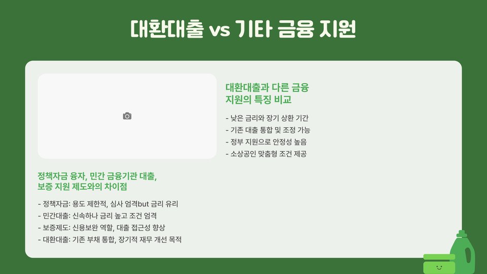 정책자금 대환대출은 정부나 관련 기관에서 지원하는 대출로, 소상공인에게 보다 유리한 조건으로 제공됩니다. 예를 들어, 금리가 낮고, 상환 기간이 유연하게 설정되는 경우가 많습니다. 반면, 민간 대환대출은 상업은행이나 금융기관에서 제공하는 대출로, 금리는 상대적으로 높을 수 있습니다.
