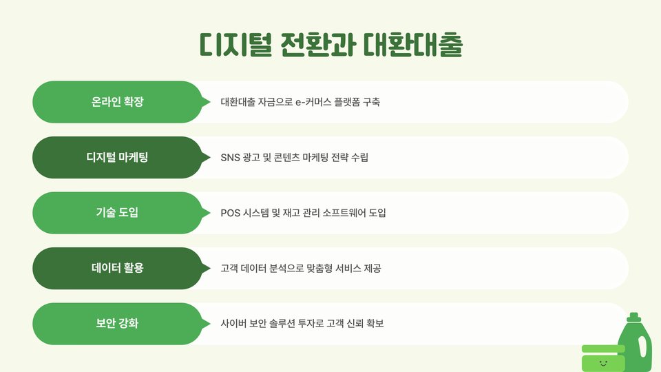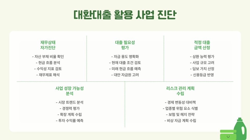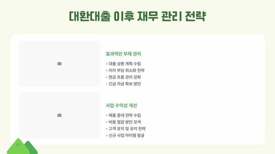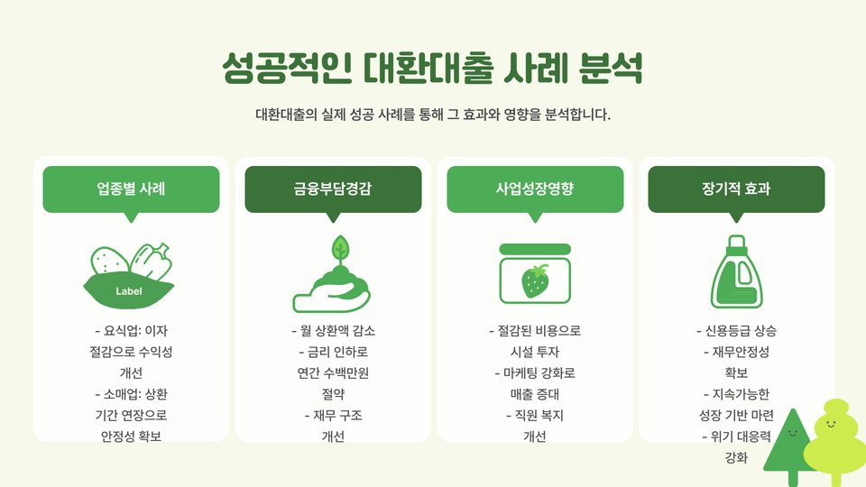 또한, 대출 신청 전에는 반드시 여러 금융기관의 조건을 비교하고, 자신의 상황에 맞는 대출 상품을 선택해야 합니다. 재정적 부담을 줄이고 안정적인 사업 운영을 위해서는 대환대출의 활용이 필수적입니다.