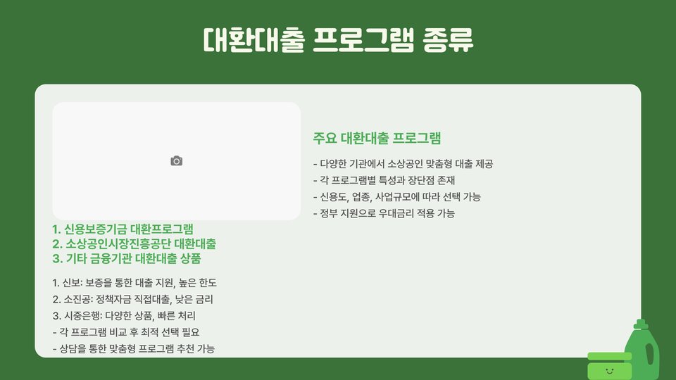 대환대출에는 여러 가지 종류가 있습니다. 예를 들어, 금융기관별 대환대출 상품이 있습니다. 각 금융기관은 소상공인 대상 대환대출 상품을 제공하고 있습니다. 이는 대출 조건, 금리, 상환 기간 등이 다르기 때문에, 소상공인은 자신의 상황에 맞게 선택하는 것이 필요합니다.