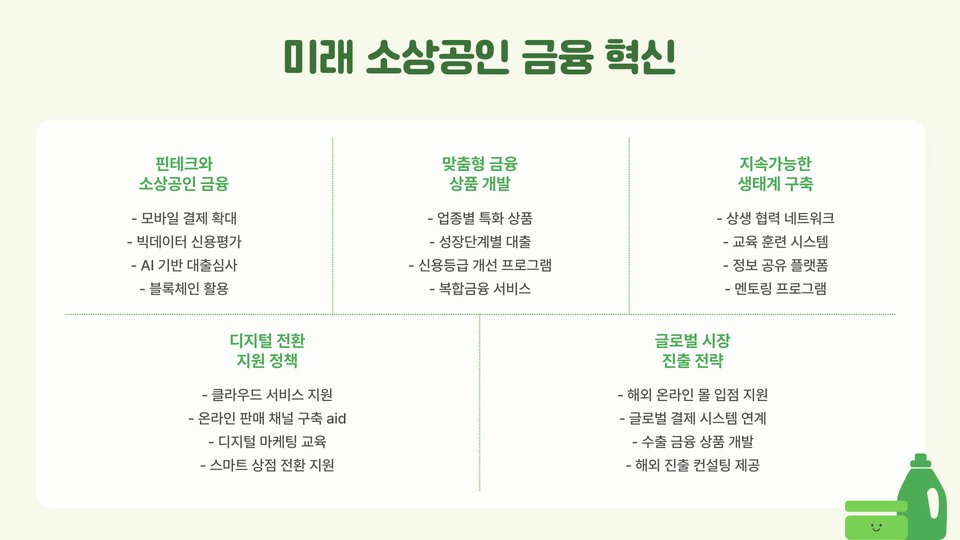 또한, 신뢰할 수 있는 재무 전문가의 도움을 받는 것이 좋습니다. 그들은 시장의 최신 동향을 반영하여 가장 효과적인 재정 전략을 제시할 수 있습니다. 개인의 경험이나 다른 소상공인들의 사례를 통한 학습도 많은 도움이 될 수 있습니다.