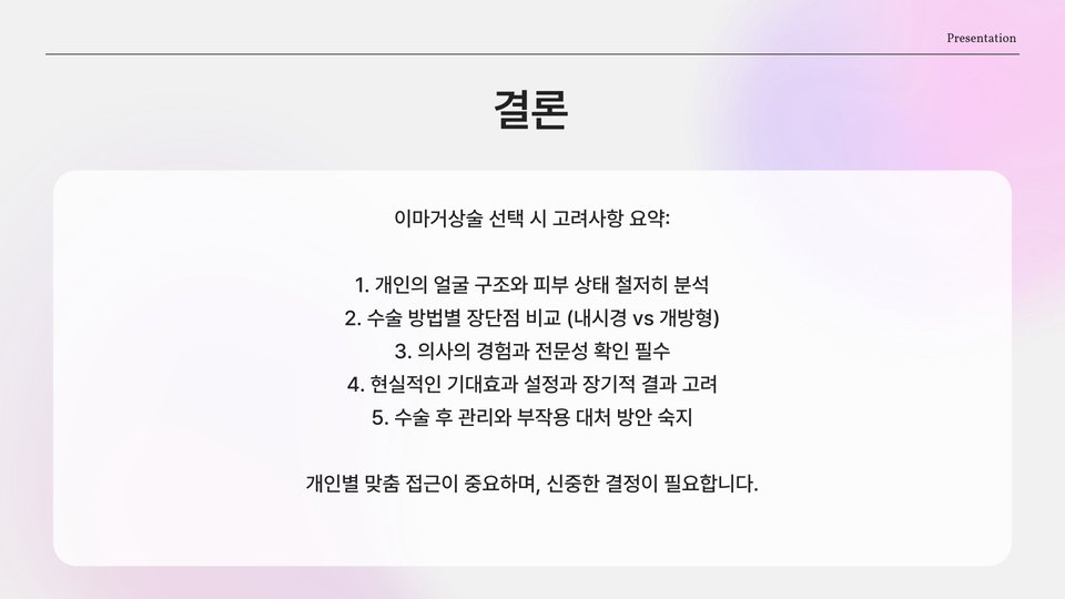 결론적으로, 이마거상은 많은 요소를 고려한 후 결정해야 하는 중대한 선택입니다. 수술의 효과와 위험성을 충분히 이해하고, 사후 관리에 주의를 기울이는 것이 필수적입니다. 가장 중요한 것은 자신의 개별적인 상황을 반영한 결정을 내려야 한다는 점입니다. 결국, 자신에게 맞는 방법과 절차를 찾는 것이 우선입니다.