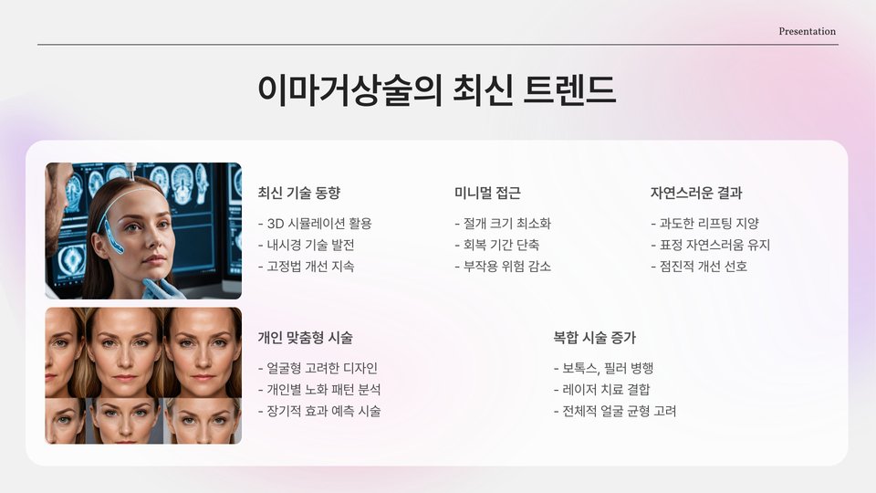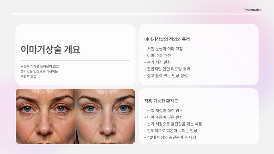 이마거상은 피부의 탄력을 회복하고 주름을 제거하기 위한 수술적 방법입니다. 이 시술은 주로 피부의 긴장을 높이고, 이마의 피부를 매끄럽게 하는 데 중점을 둡니다. 이마거상의 다양한 기술 중 선택할 수 있으며, 각 기술의 결과는 다를 수 있습니다. 예를 들어, 내시경 이마거상은 최소한의 절개로 진행되며 회복 시간이 짧은 반면, 전통적인 이마거상은 더 뚜렷한 결과를 제공합니다.