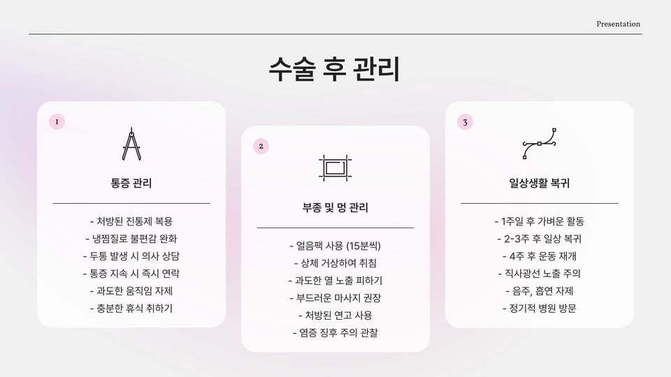 이마거상 시술 후 적절한 관리가 필요합니다. 회복 기간 동안에는 정기적인 얼음찜질이나 안정적인 자세 유지가 도움이 됩니다. 또한, 의사의 지시에 따라 약물을 복용하고, 감염 예방을 위한 청결을 유지해야 합니다. 이러한 관리 방법을 통해 회복 과정을 빠르게 하고, 최상의 결과를 얻을 수 있습니다.