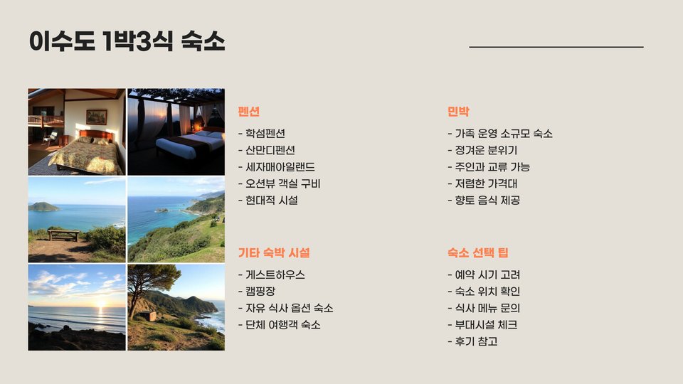두 번째로는 숙소의 위치입니다. 이수도는 아름다운 자연경관을 자랑하는 만큼 숙소에서의 전망이나 접근성이 중요합니다. 해변 근처나 주요 관광지와 가까운 위치에 있는 숙소라면 더 좋은 경험이 될 수 있습니다.