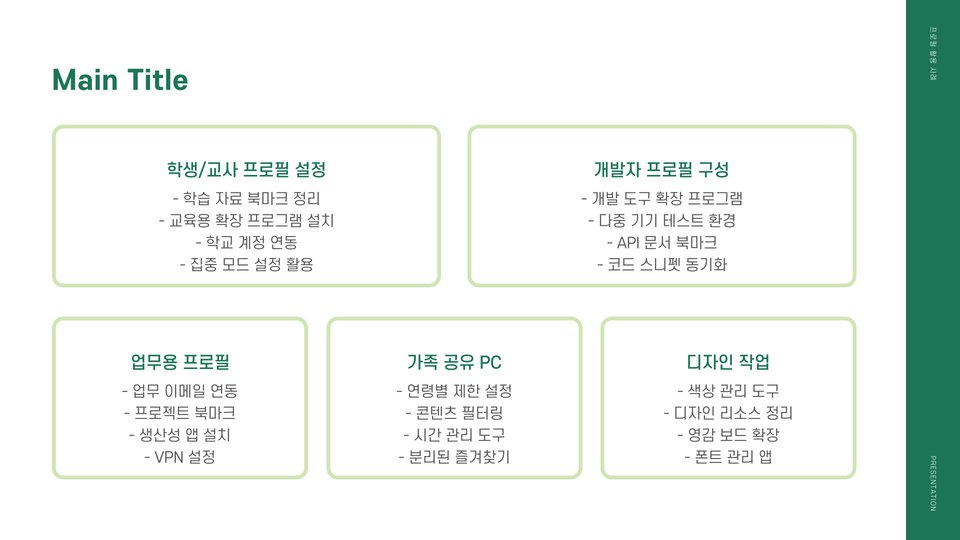 | 프로필 아이콘 클릭 → 프로필 추가 | 설정 메뉴 → 각 프로필 환경 설정 |