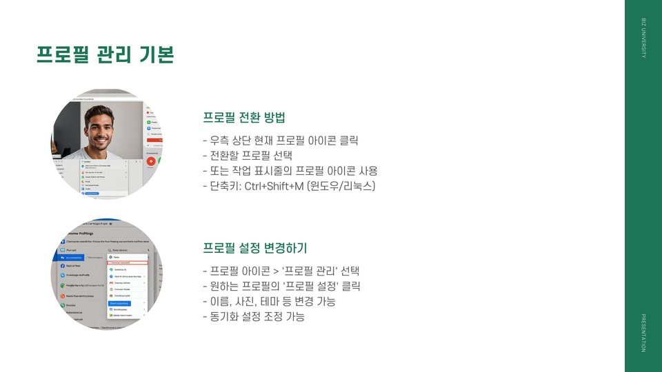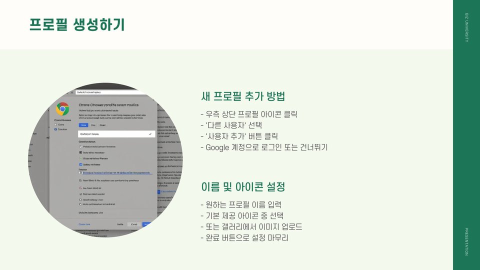 크롬 프로필을 생성하고 관리하는 방법은 간단합니다. 크롬의 오른쪽 상단에 있는 프로필 아이콘을 클릭하면 프로필을 추가하거나 전환할 수 있는 메뉴가 열립니다. 또한, '설정' 메뉴를 통해 각 프로필의 세부 설정을 변경할 수 있습니다.