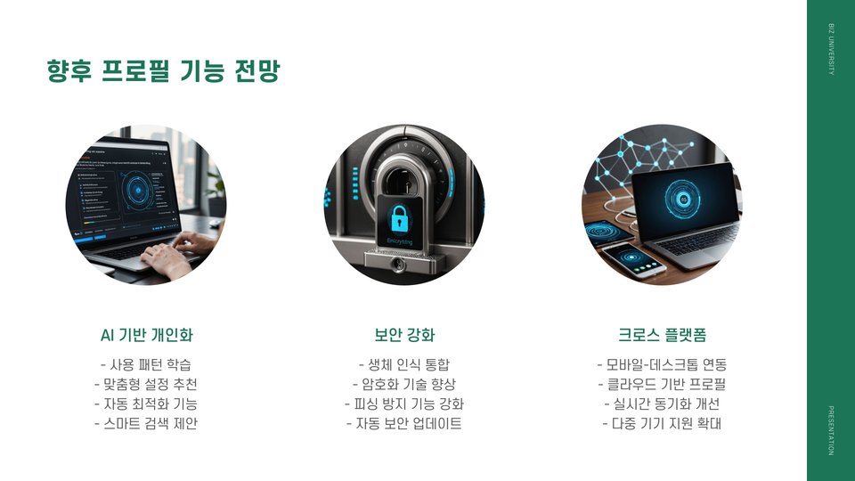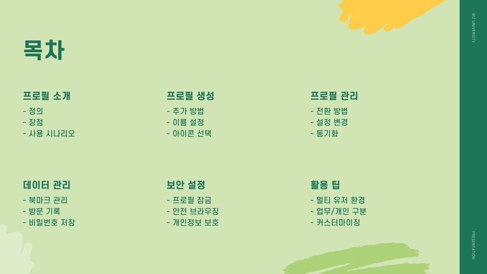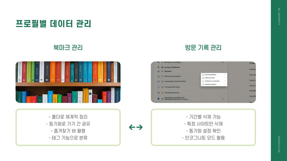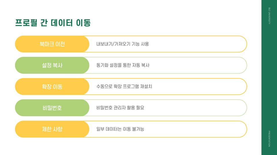 프로필을 통해 사용자는 자신만의 테마를 설정하거나 즐겨찾기 바를 구성할 수 있습니다. 이러한 개인화는 사용자가 보다 편리하고 빠르게 인터넷을 탐색할 수 있도록 돕습니다. 특히, 직장과 개인 생활을 분리하고 싶거나, 다양한 프로젝트를 관리해야 하는 경우 유용합니다.