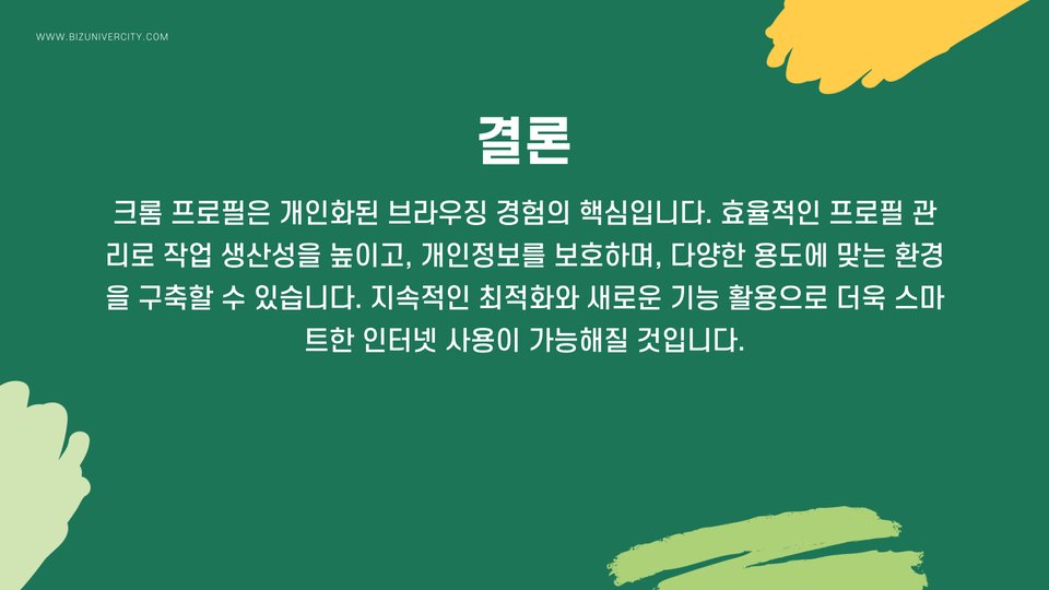 크롬 프로필은 개인화된 브라우징 경험을 제공하는 매우 유용한 도구입니다. 이를 통해 사용자는 자신만의 작업 환경을 만들고, 개인 정보를 안전하게 관리할 수 있습니다. 꼭 필요할 때 프로필을 생성하고, 각 프로필의 특성을 잘 활용하여 보다 효율적으로 인터넷을 사용하시기 바랍니다.