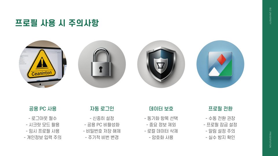 크롬 프로필을 사용할 때 유의해야 할 점도 있습니다. 먼저, 프로필 간에 데이터를 공유하지 않으므로, 중요한 정보가 있는 경우 각 프로필에서 백업을 잘 해두어야 합니다. 또한, 공용 컴퓨터에서 개인 정보를 입력할 경우 보안에 주의해야 합니다.